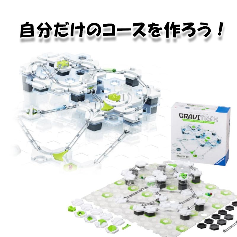 グラヴィトラックス スターターセット 【商品の特徴】 ●デザイン! - 説明書に沿って、またオリジナルのボール・レースコースの組立に挑戦しよう! ●創る! - 18のユニークなアクションパーツが100ピース以上も入ったスターターセットで組立開始! ●レース!- ボールの運命は引力に作用されるが、進路を変える力はキミの手に! ●学ぶ!- 引力や磁力、動力といった科学工学のコンセプトでSTEM(Science, Technology, Engineering, Mathematics)分野を楽しく体験できる! GraviTraxは、自分のオリジナル・デザインでトラックを組み立て、ボールを走らせるトラックシステムです。
